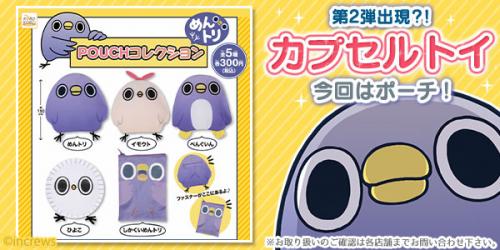 めんトリカプセルトイ第2弾として「ポーチ」が発売開始!子どもだけでなく大人からも人気のあるカプセルトイの第2弾として「めんトリ」がポーチになって登場です。ポーチは全5種類となっており、今回はめんトリ、イモウト、ぺんぐいん、ひよこが登場。ちょっとした化粧品を持ち歩くための入れ物としても、家の鍵を失くさないように収納する入れ物としても、様々な用途で「めんトリ」がサポート致します。8月29日(水)より順次導入しておりますので、こちらのカプセルトイを見かけましたら面倒くさがらずにトリあえず回してみてください。