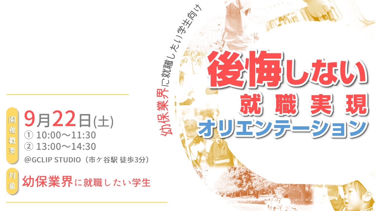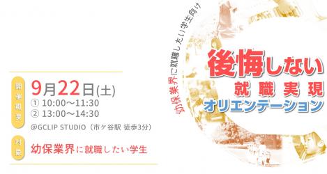 全国の私立幼稚園・認定こども園のマーケティングに特化したコンサルティングを行う株式会社Gクリップコーポレーションは、9月22日(土)に幼稚園教諭・保育士を目指す学生に向け「後悔しない就職実現オリエンテーション」を開催します!場所は、市ヶ谷駅から徒歩3分にある「Gクリップスタジオ」にて。10:00~11:30、13:00~14:30どちらかにご参加いただけます。