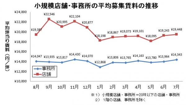 池袋の小規模事務所(20坪以下)の7月度平均募集賃料は、前月から2.7%上昇しました。