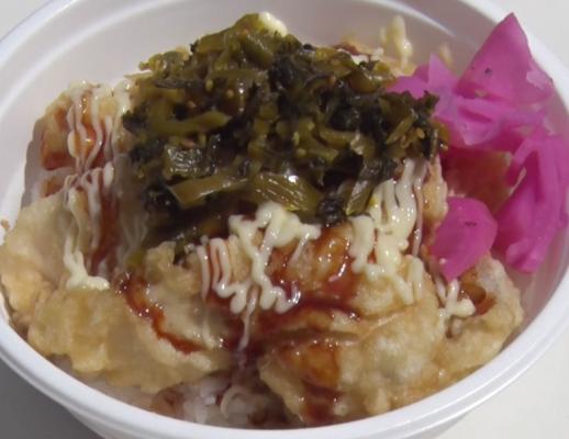 また、「いちや」のとり天丼は、元々バイトの賄いから生まれたメニューでそれをお客さんに提供したところうまいと評判でメニュー化したという。とり天丼は、宮崎産の鶏の胸肉を使用し、衣はサクサク、中の胸肉は驚くほど柔らかくジューシーで食べごたえもあった。