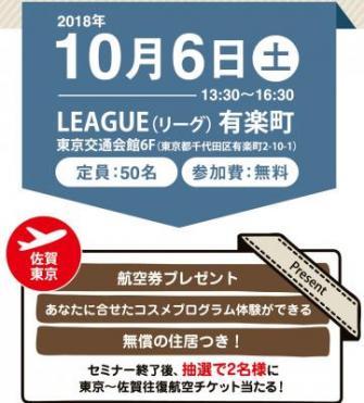 10月6日(土)東京 有楽町の東京交通会館6階にある、LEAGUEにおいて、コスメ起業家を目指す方を応援するためのセミナーを開催。化粧品の基礎知識からコスメビジネス入門セミナーのあとは、佐賀県唐津市で実際に「美」の創業者として活躍中の4人によるトークイベント、実体験を多いに語っていただきます。仕事だけでなく、”暮らし”サポートも充実、最後は、抽選で航空券のプレゼントもあり!コスメビジネスをするなら充実のサポート体制を持つ佐賀県唐津市ならではの、ビジネス・資金補助・お住まいなどの暮らしのサポートまでをトータルでご案内。コスメでの起業や移住にご興味のある方は、ぜひご参加ください。