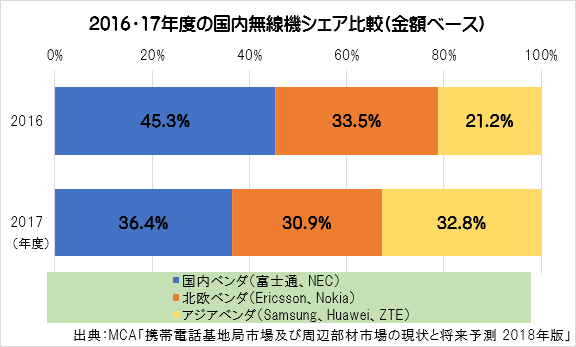 NTTドコモは他キャリアに比べ、無線機の調達規模が大きく、NTTドコモでのシェア獲得が国内市場での地位固めにつながっている。しかし、2017年度はNTTドコモによる基地局投資抑制が進んだ結果、両社とも、大きくシェアを落とした。
