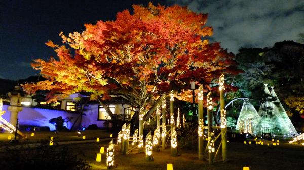 旧熊本藩ゆかりの地である肥後細川庭園。普段は17時で閉門いたしますが、紅葉の時期には期間限定で“夜の日本庭園”をお楽しみいただけます。 「松聲閣」や紅葉、松の雪吊りなどのライトアップに加え、『竹あかり』の設置など、園内全体が幻想的な雰囲気に包まれます。この期間にしか見ることのできない庭園の姿をお楽しみください。
