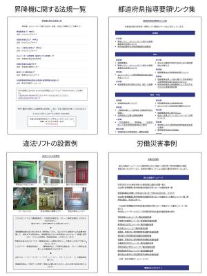 (3)昇降機に関する法規一覧、(4)都道府県指導要領リンク集、(5)違法リフトの設置例、(6)労働災害事例の4コンテンツを増設する。