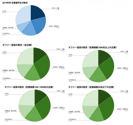 上記の円グラフは、企業規模ごとに算出した企業規模別のオファー送信率を表している円グラフです。大学群による大きな偏りは認められません。