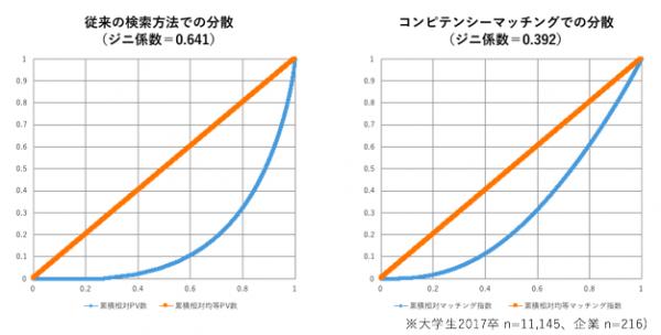 ※ジニ係数は、主に社会における所得分配の格差を測る指標です。格差がないほど直線(均等分布線)に近づき、格差があるほど右下の1に近づく弧になります。株式会社イー・ファルコンが提供する適性検査eF-1G(R)を用いて株式会社i-plugが行った調査では、パーソナリティでマッチングした場合、ジニ係数は0.392。日本の所得格差と同程度となりました。今後も、追加調査を実施する考えです。