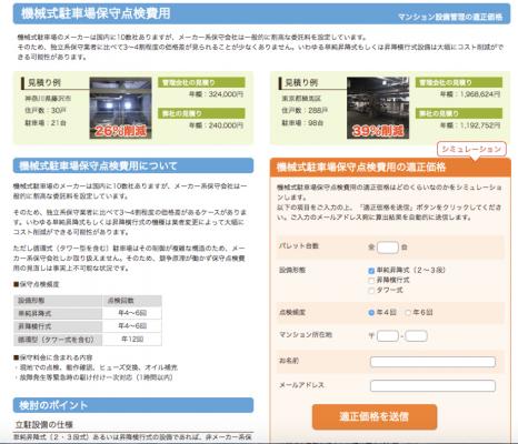そこで、管理組合様のお悩みの解消に役立つツールとして、エレベーターや機械式駐車場といった共用設備の保守点検や更新工事に関する適正な仕様や価格を簡単に把握できるシステムを開発し、これらの「適正価格」をサイト上で簡単に試算できるようにしました。