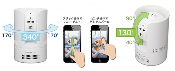 パン(左右)340°、チルト(上下)130°の範囲でカメラの向きを操作することができ、本製品一台だけで、広い範囲を撮影可能です。あらかじめ設定した撮影ポイントを順番に移動する巡回機能も搭載し、広い範囲の監視をサポートします。