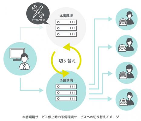 この度提供を開始した予備環境サービスは、通常利用する環境とは物理的に異なるデータセンターにあらかじめ予備の環境を用意しておき、通常環境でサービス停止が発生した場合には予備環境に切り替えて運用を継続することが可能になるというものです。