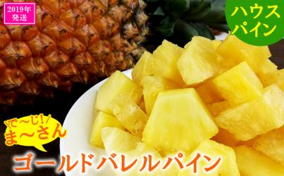 ハウス栽培パインです 沖縄県の北部に位置する緑豊かな「ヤンバル」で栽培された生食用の極上なゴールドバレル! 完熟状態なゴールドバレルを発送いたしますので、届いたらすぐにお召し上がりください。 柔らかい果肉から溢れ出す果汁、噛むたびに甘さが口いっぱいに広がります。 糖度が非常に高く酸味がほとんどない最高品質のゴールドバレルパインです。 パインの中でも特に甘い!ゴールドバレルパイン ゴールドバレルは、パインのなかで比較的新しい品種です。 果肉の色が輝いてみえることから「Gold(ゴールド)」、樽のような形の「Barreel(バレル)」から「ゴールドバレル」と名付けられました。 ゴールドバレルの最大の特徴は「大きさ」と「甘さ」です。 大きさ(重さ)はおよそ1.5Kg~2Kgと、パインの中でも大きいのが特徴です。 そして、その甘さは格別!他のパインと比べて酸味が少なく、まるでシロップに漬けた缶詰のパインのような甘さが味わえます。 お届けするゴールドバレルは、ベテラン農家さんが丁寧に一つひとつ育てています。 最高品質のゴールドバレルを是非ご賞味下さい!