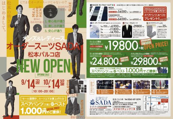 仙台・北京で年間12万着、日産500着のオーダースーツ専門メーカー「工場直販オーダース―ツSADA」の(株)佐田(東京都千代田区岩本町、社長:佐田展隆)は、長野県で初めて松本に、来る9/14(金)10時「工場直販オーダースーツSADA松本パルコショールーム」をオープン致します。場所は、JR松本駅から徒歩5分のお客様の利便性の良い場所です。