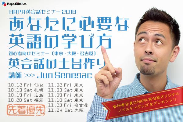 日本最大級の英語学習メディア「Hapa英会話(https://hapaeikaiwa.com)」を運営する株式会社HAPA英会話(本社:東京都渋谷区、代表取締役:セニサック・ウィリアム・ジュン)は、2018年9月10日(月)、毎年大好評頂いているHapa英会話セミナーを、2018年10月から11月24日にかけて、札幌、仙台、東京、名古屋、大阪、広島、福岡で開催することを発表いたします。