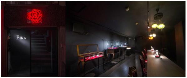 本ギャラリーのコンセプトは「秘密基地のバー」。店内には予約優先でジュエリーのマスターコンサルタントによって、最高級のシャンパーニュやドリンクを楽しみながら、最上のジュエリー提案を受けられるバーカウンターや入場フリーでEIKAの華やかなコレクションたちをご覧頂けるギャラリーがあり、販売ではなく提案と体験に特化した、ブランド体験型のストアとなっております。
