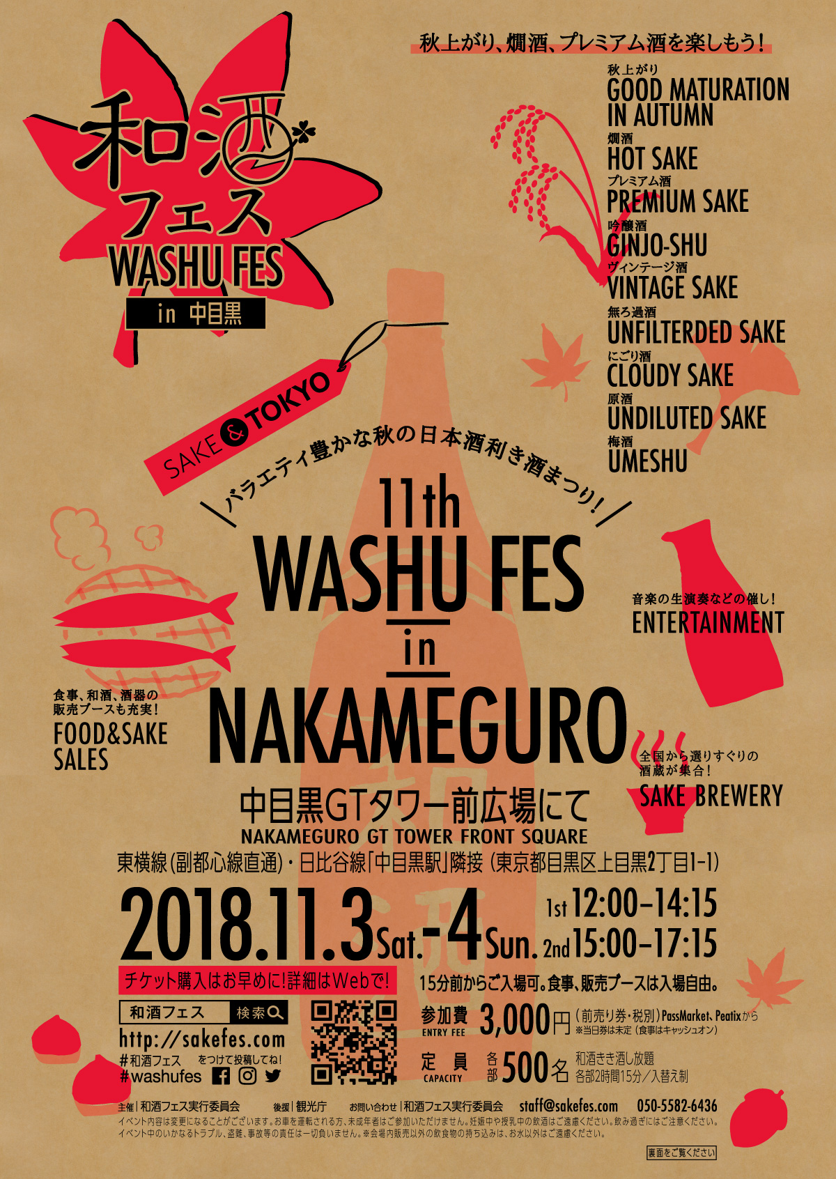 和酒フェス実行委員会は、バラエティ豊かな秋の利き酒まつり『第11回 和酒フェス in 中目黒』を東急東横線(副都心線直通)・日比谷線の中目黒駅直結の中目黒GTタワー前広場(東京都目黒区)で、11月3日(祝・土)、4日(日)に開催いたします。利き酒ゾーンでは、「秋上がり、燗酒、プレミアム酒を楽しもう!」をテーマに、全国選りすぐりの酒蔵が来場者と交流しながら、秋だから味わえるまろやかで深みのある秋上がり、からだに優しい燗酒などを季節を感じながら屋外会場で振舞います。