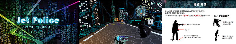 アクションとシューティングの要素をMIXした、宇宙都市を駆け巡るVRゲーム。地球よりちょっと文明の進んだ宇宙都市で“特別宇宙都市警察”に任命された。ジェットボードに乗って街を駆け巡り犯人を捕まえろ!プレイヤーは拳銃型のコントローラーと、スケートボード型のジェットボードに乗って体を動かしながら操作。VR技術で表現される臨場感溢れる世界の中で、街を駆け巡る爽快感とシューティングの緊張感を両方味わおう。