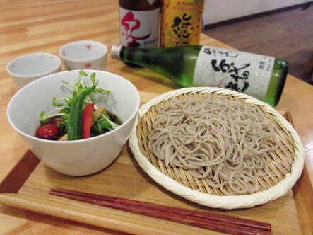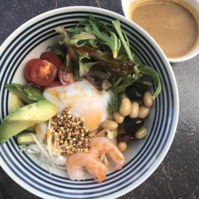 旬の野菜や海老、半熟玉子、蕎麦の実をのせた蕎麦をスパイシーな胡麻ダレでごちゃ混ぜ(ガドガド)にしてお召し上がりいただくヘルシーな蕎麦メニューです。