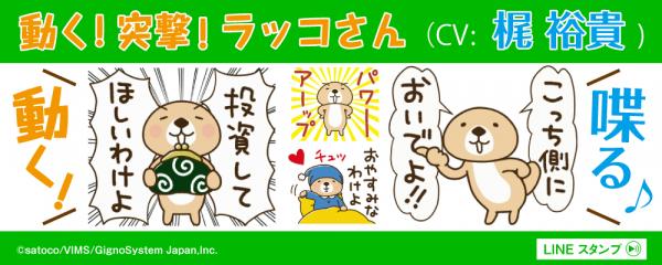 ジグノシステムジャパン株式会社(本社:東京都千代田区、代表取締役社長:沼尻一彦)は、LINE株式会社(本社:東京都新宿区、代表取締役社長:出澤剛)が運営する無料通話・無料メールアプリ「LINE」内のスタンプショップにて、2018年9月13日より「突撃!ラッコさん」の動く&ボイス付きスタンプ「動く!突撃!ラッコさん(CV:梶裕貴)」のLINE公式スタンプの配信を開始しました。