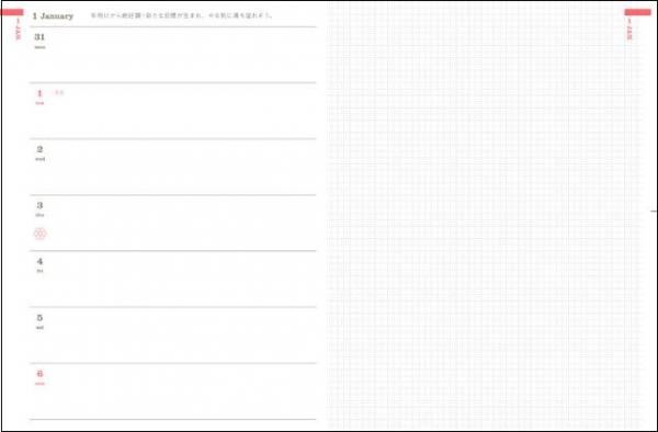 デザインだけでなく、手帳としての機能性にもこだわりました。週間ページは、レフトタイプ(見開きの左側が1週間の予定を書き込める欄、右側が方眼のフリースペース)となっており、占いとともに暮らしのサポートをしてくれます。また、机上で180度しっかり開く製本方法を採用し、記入がしやすいのも大きなポイントです。
