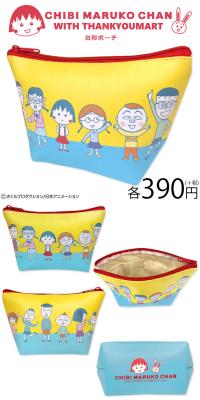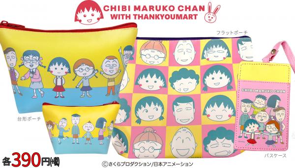今回発表するのは、パステルカラーを基調にまる子と家族、3年4組のクラスメート達がデザインされたふんわり可愛い合皮台形ポーチ、合皮フラットポーチ、合皮パスケースの3種です。