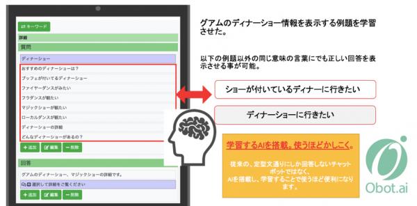 海外でリゾートホテル、ゴルフ場、レストラン及び旅行会社などのリゾート、観光業の経営を行う株式会社MARIANA OCEAN JAPAN(代表:北見 好拡 所在地:東京都渋谷区恵比寿)は、2018年9月19日より今までの「Obot.ai」から「ObotAI」にサービス名を変更いたします。また、大手旅行代理店JTBグループの株式会社パシフィックミクロネシアツアーズ運営のグアムの現地オプショナルツアーの予約、観光旅行情報サイト「ココ夏ッ通信」にて、接客品質とオペレーション効率を向上させることを目的にAIチャットボット作成支援ツール「ObotAI」を2018年9月3日より導入致しました。