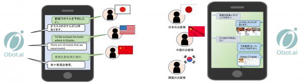 訪日外国人の増加により、職場、ホテル、レストラン、多くの場面で日本語以外でのコミュニケーションが必要となってきております。AIを組み込んだチャットボット導入により、様々な状況においてスタッフに代わり、多言語で対応いたします。例えば、外国人観光客が商品の説明を求めてきた場合、ObotAIが代わって、その国の言語で商品説明を行います。外国人スタッフが業務の質問をしてきた場合には、ObotAIが代わってその国の言語で回答したりします。このように簡易的な接客対応の軽減を実現し、本来の業務に従事頂く事が可能となるのです。