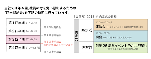 内定式(=運動会等)は、1995年、新卒第1期の内定者の時から第3四半期納会に組み込んで行っています。