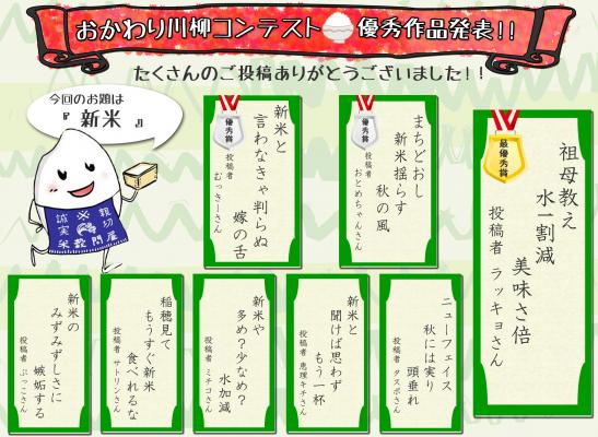 米穀の製造加工および販売を手掛ける株式会社むらせ(本社:神奈川県横須賀市米が浜通1-6、村瀬 慶太郎 社長)が運営する“むらせライスサポーターサイト” において、8月1日(水)から8月31日(金)まで開催した、「おかわり川柳コンテスト」の結果を9月13日(木)に発表いたしました。