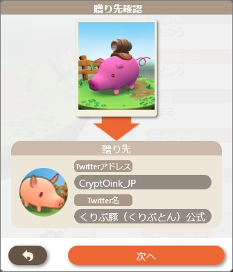 「くりぷトン」のプレゼントは、「くりぷ豚」を遊んだことがない人へ行うことも可能です。当機能で送られてきた「くりぷトン」は、Twitterアカウントに紐づいて自動的に生成される ”簡易的なWallet(Twitterアドレス)” に届くシステムとなっております。