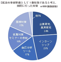 「就活の事前準備として1番有効であると考え、実際に行った対策は?(複数回答)」との質問には、729の回答数があり、「企業研究・業界研究」が24%、「インターンシップ」23%と、半数近くを占めているのが分かります。次に「自己分析ツール」17%、「就職対策セミナーの参加」16%、「面接対策」15%と続きました。その他の回答の中には「OB・OG訪問」の他に、「起業セミナーの参加」という意識の高いものから、「人生の目標を死ぬほど考える」という独自の対策をする就活生もいました。