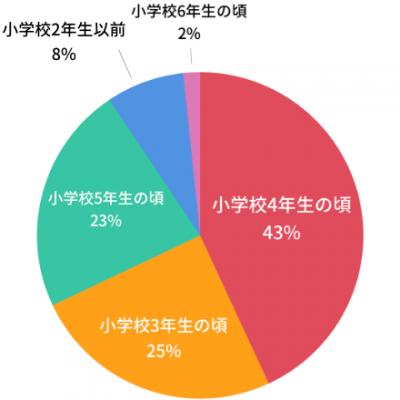 学校説明会に行き始めた時期について、「小学校4年生の頃」が43%、「小学校3年生の頃」が25%、「小学校5年生の頃」が23%、「小学校2年生以前」が8%、「小学校6年生の頃」が2%という結果になりました。