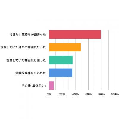 「行きたい気持ちが強まった」が80%弱で圧倒的に多く、「想像していた通りの雰囲気だった」が50%弱、「想像していた雰囲気と違った」と「受験候補から外れた」が約55%という結果になりました。
