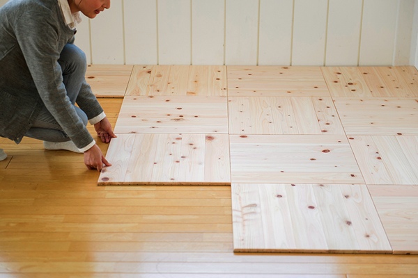 並べて置くだけで、賃貸でもオフィスでも、どこでも無垢の床が楽しめる「ユカハリ・タイル」。