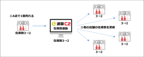 「速販C2」に在庫数連動機能を追加すると、複数の店舗の在庫数を連動させることができます。