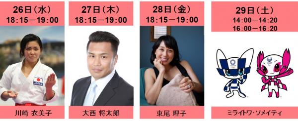 26日18:15-19:00…川崎 衣美子 27日18:15-19:00…大西 将太郎 28日18:15-19:00…東尾 理子