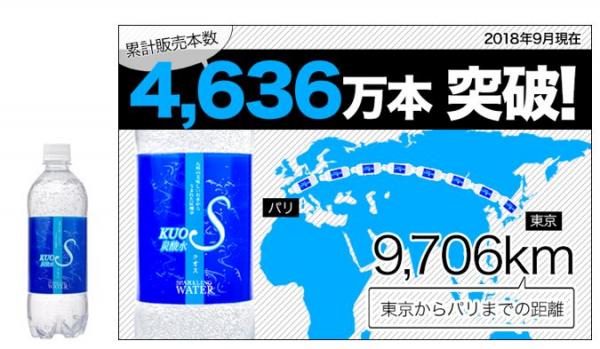 株式会社 OTOGINO(オトギノ:社長 鬼武公洋 本社 大分県日田市北友田 2 丁目 2123 番地 1)が E-コマー スにて販売している主力商品、うまさを感じる強炭酸水『KUOS-クオス-』の 累計販売本数が4636万本(2018年9月18日)に達しました。これは、縦に並べると距離で東京からパリ間に相当します。