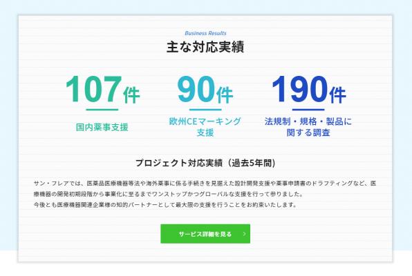 今回のリニューアルでは、サン・フレア リサーチ&コンサルティング部門が提供する「医療機器に関する薬事トータルサポート」に関するサービス内容やプロジェクト実績等について、ご利用される皆様にわかりやすくお伝えすることを目指し、構成・デザインの一新、コンテンツの拡充を実施いたしました。