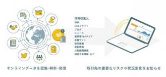 取引先を登録しておくだけで、取引先の重要なリスクや状況変化をお知らせする企業調査サービスです。SNS、ブログ、口コミサイトなど、オンラインデータを中心に収集・解析、取引先の重要なリスクや状況変化をお知らせします。いち早く取引先の状況変化をキャッチすることで、未回収リスクの回避などに活用されています。