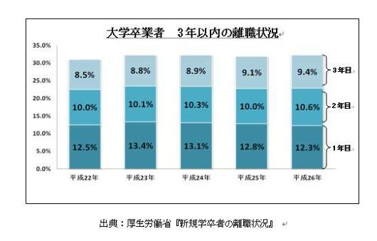 現在、新卒学生の一括採用撤廃の方向性がある中、今後、インターンシップからの採用は激化することが見込まれます。また、優秀な学生に対しては早い段階で内定を出し、企業が人材確保をおこなうケースが増える可能性があります。一方、厚生労働省「新規学卒者の離職状況」によると、入社後の新入社員の早期離職率は3年3割と言われています。