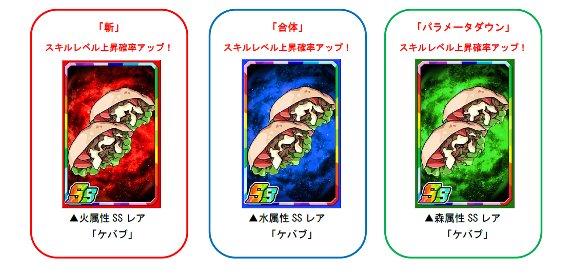 「千夜一夜P」を使い素材ガチャを回すと、限定の強化素材「ケバブ」を手に入れることができます。限定強化素材「ケバブ」は一部のモンスターに使うと強化値2倍の効果があるほか、斬スキル・合体スキル・パラメータダウンスキルのスキルレベル上昇確率もアップします。