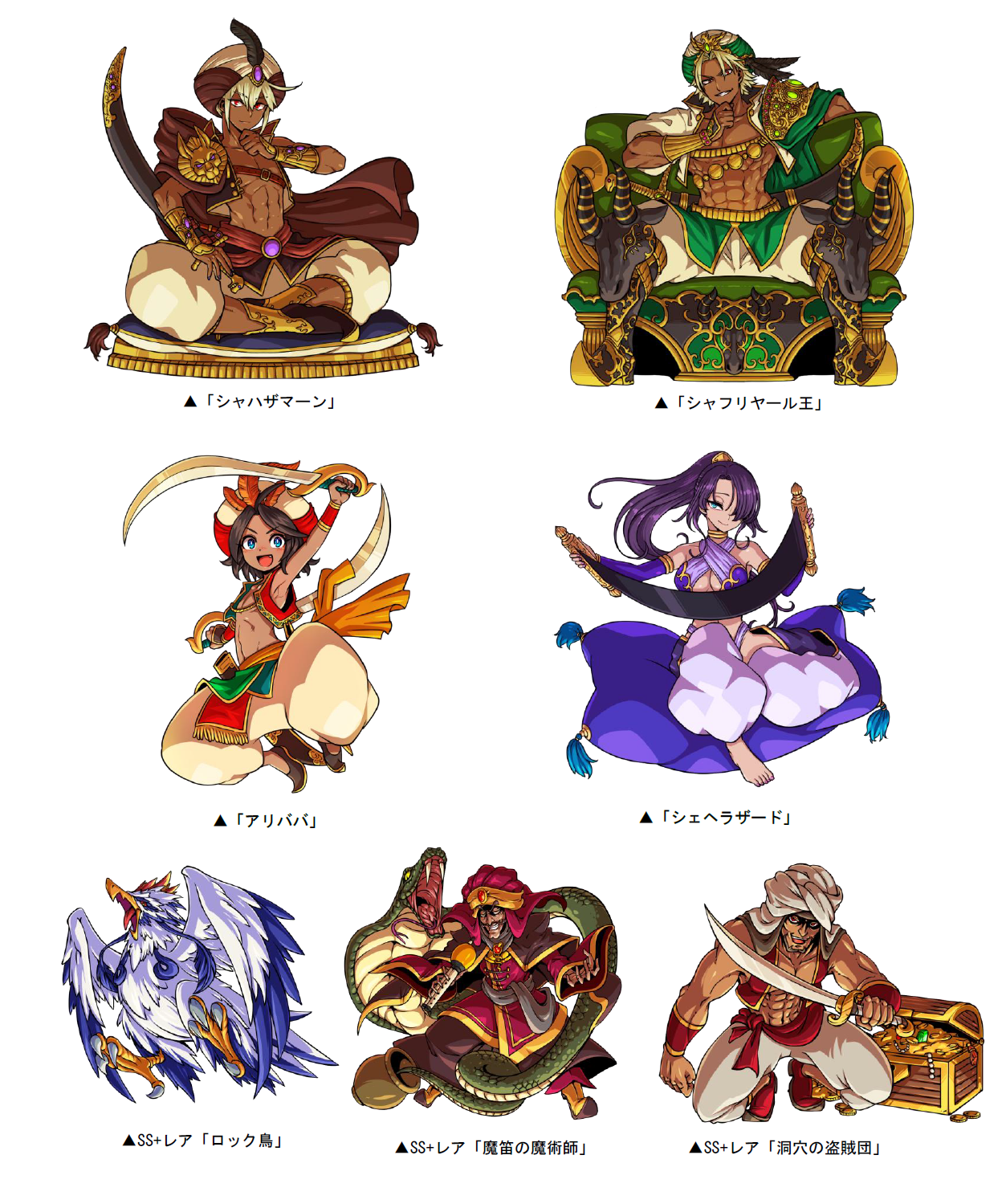 本ダンジョンには、ボスとして「シャハザマーン」や「シャフリヤール王」「アリババ」「シェヘラザード」「シンドバッド」「アラジン」が登場!さらに、クリアした際に手に入る「千夜一夜P」を貯めると、ポイントに応じてSS+レア「ロック鳥」や「魔笛の魔術師」「洞穴の盗賊団」と交換することができます。仲間と一緒に協力して強敵たちに挑みましょう!
