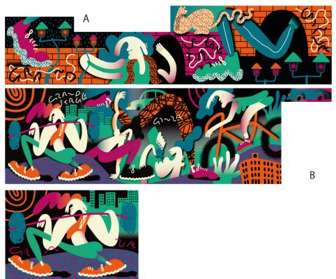 並木通り側・マロニエゲート側両面のファサードで一際目を引く2F壁画のデザインは、湘南出身多摩美術大学卒業の26歳平成生まれのアーティストKeeenue(キーニュ)氏が「GRAND STAGE GINZA」の為に描いた、ショップを象徴するアートワークになっています。