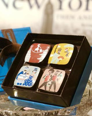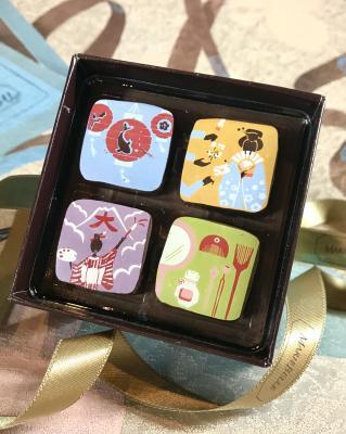 New Yorkガナッシュは、自由の女神が扇子を持っていたり、それぞれの都市の象徴であるエンパイアステートビルと五重塔を橋渡しにする女性など、こちらも全4種のラインナップです。