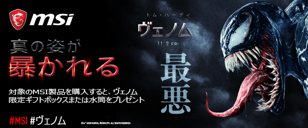 また、現在MSIマザーボード、グラフィックスカード、デスクトップPC、モニターおよびゲーミングギアのTwitterアカウント @msicomputerjp では、MSIのマスコットキャラクターであるラッキーくんをPhotoshopで”ヴェノム化”し、10月28日までにTwitterやInstagramにハッシュタグ #MSIxVenomとともに投稿すると、最優秀作品を投稿された方に、ヴェノムバージョンのTrident 3が贈られます。さらに、10月5日まで、ヴェノムのゲーム (http://www.venomunleashed.co.uk/)をプレイして、ハイスコアを記録した方の中から上位3名様に、10月下旬予定のプレミア試写会のペアチケットを差し上げます。このほか、ヴェノムのTwitterアカウント (@VenomMovieJP)とMSIのTwitterアカウントの両方をフォローし、MSIのヴェノム関連のツイートをリツイートしていただいた方の中から10名様にヴェノムの劇場招待券をペアで差し上げます。