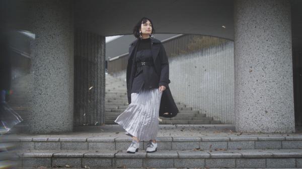 ある日、秋の装いで颯爽と歩く佐田真由美さん。