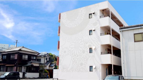 建物の塗装工事において、外壁に模様やイラストを描く「デザイン塗装」。今回は下関市内にある築40年のマンション外壁に大きなひまわりのイラストを描いた物件にて応募しました。