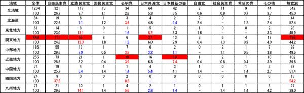 自民党は東日本よりも西日本で支持率が高い傾向がある一方で、立憲民主党の支持は特に関東地方で多く、九州地方を除く西日本では弱いことが分かりました。公明党に関しては北海道で比較的強い以外は西高東低の傾向にあり、日本共産党に関しては立憲民主党と同様に東高西低傾向があるものの、近畿地方での支持は比較的強いと言えます。日本維新の会については、大阪府のある近畿地方での支持が他地域よりも強いのは当然でありますが、関東地方でもそれなりの支持者がいることは留意すべきといえるでしょう。