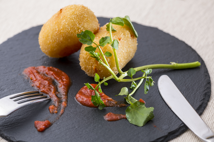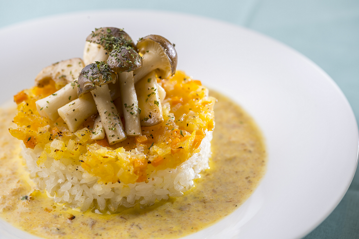 いちほまれ特有のもちっとした食感と甘さを、野菜と鶏ガラスープで引き出しました。10月から解禁となるズワイ蟹と合わせて旨味をギュッと閉じ込め、イタリア料理スップリ(クリームコロッケ)に仕立てました。