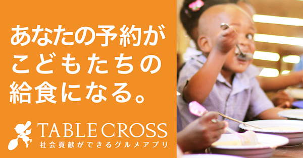 一方、グルメアプリ「テーブルクロス」は、お客様が飲食店の予約をすると、予約した人数に応じた給食が途上国のこどもたちに届く、社会貢献ができるグルメアプリです。現在、40万DL、飲食店掲載数約6,000店舗、累計で19万食以上の給食を届けています。アプリはスマートフォンから無料でダウンロードすることができます。