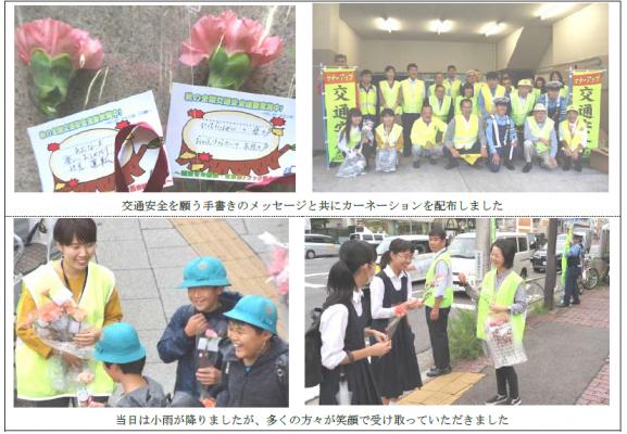 街頭活動は、9月26日に小学生たちが下校する時間帯に合わせて実施されました。当日参加した有志の協力会員が、小学校近くの亀戸交番交差点付近にて、恒例となった手書きのメッセージカードをつけたカーネーションを配布し、事故防止と交通安全を呼びかけました。