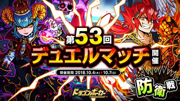 株式会社アソビズム(本社:東京都千代田区、代表取締役:大手智之)は、App Store・Google Playにて好評配信中のリアルタイム合体カードバトル『ドラゴンポーカー』で、2018年10月4日(木)より「第53回デュエルマッチ本戦」を開催いたします。今回のルールは「防衛戦」です。デュエルマッチでは、バトルで獲得できる「デュエルP」に応じてランキングが決まり、リーグ終了時に報酬が獲得できます。また、累計勝利数に応じて、限定カードも手に入ります。相手の心理を読み、1vs1の真剣勝負に挑みましょう!